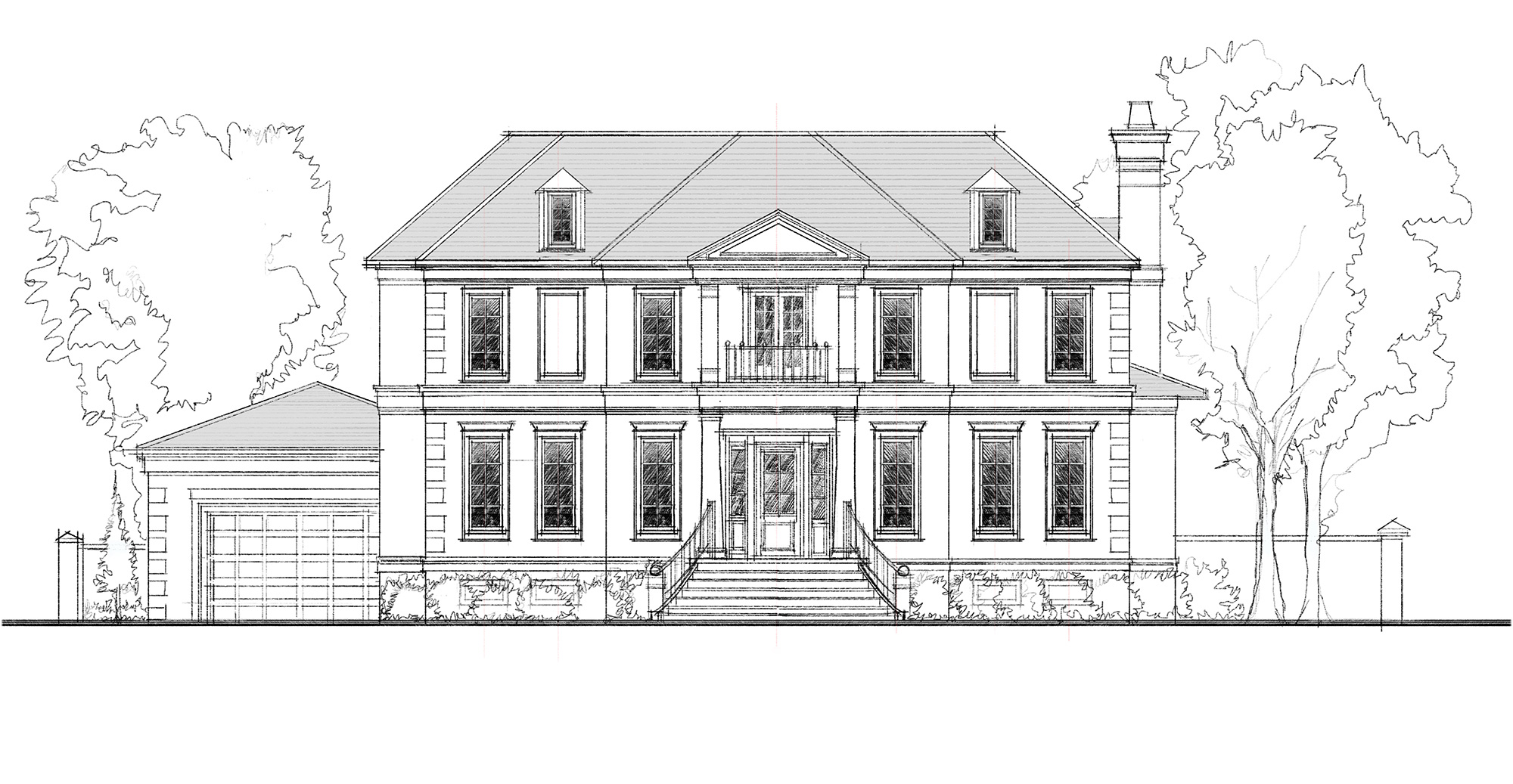 Home Story: True to Georgian aesthetic principles, symmetry is a dominant element, with a clear, formal balance leading the way. This early sketch illustrates the homeowner’s desire to remain true to the style.