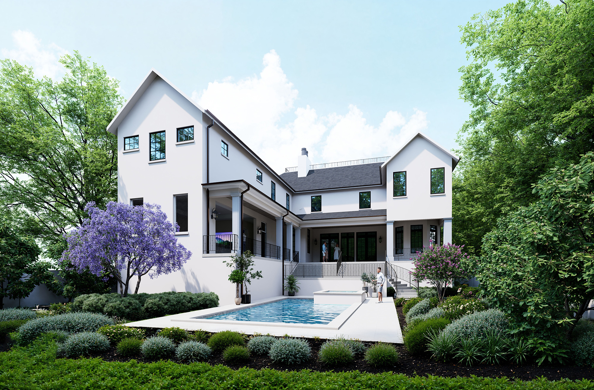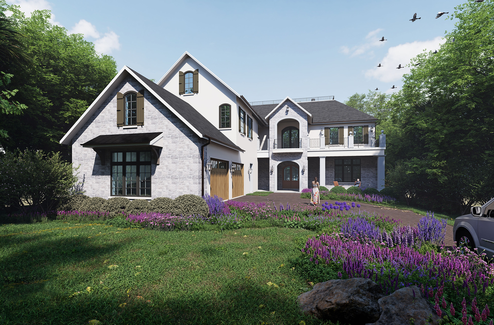 Home Story: The homeowners enjoy the rich, timeless features of European Transitional style, which resonates with their Connecticut roots. The use of classic European architectural elements such as stone and stucco facades, multi-gabled roofs with dormers, and balconies with decorative railings, combined with modern design sensibilities of clean lines and simplified details complete the transitional approach.